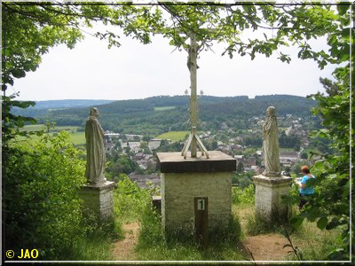 - Steek het spoor hier over en iets verderop de Ourthe (vanaf de brug heb je een uitzicht op De Cavarieberg). Net voor Café de la Poste sla je linksaf een straatje in en dat daalt tot het riviertje de Aisne. Je steekt niet het riviertje over, maar houdt rechts van een bakker aan (La petite Batte). Loop door tot het grote kruispunt.
