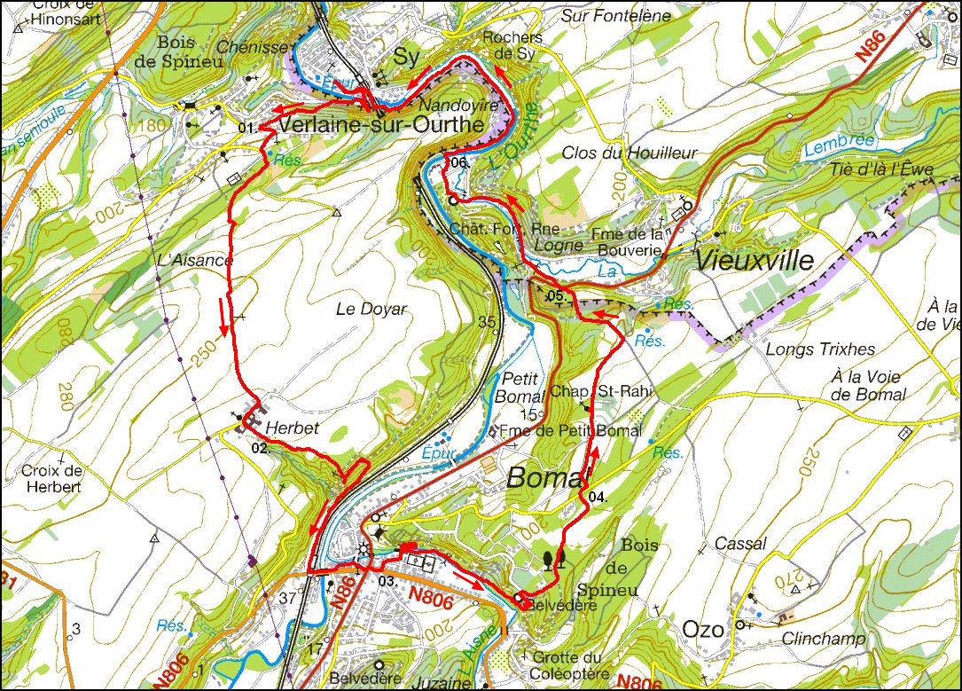 - Steek de Ourthe via de voetgangersbrug over. Je volgt nu de Ourthe over het betonnen pad stroomafwaarts (zo'n kleine 2 km). Bij Sy ga je direct na de spoorbrug gepasseerd te zijn meteen linksaf het talud op.